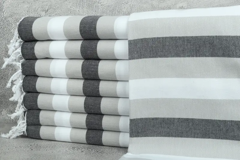 Premium Turkish cotton characterizes the 40"x67" black-gray towel, ensuring superior absorbency and softness. Weaving tolerances of up to 2" or 5 cm maintain consistent quality. Weighing 340 grams and available in both inches and centimeters, this towel features precision-crafted dimensions for versatile use.