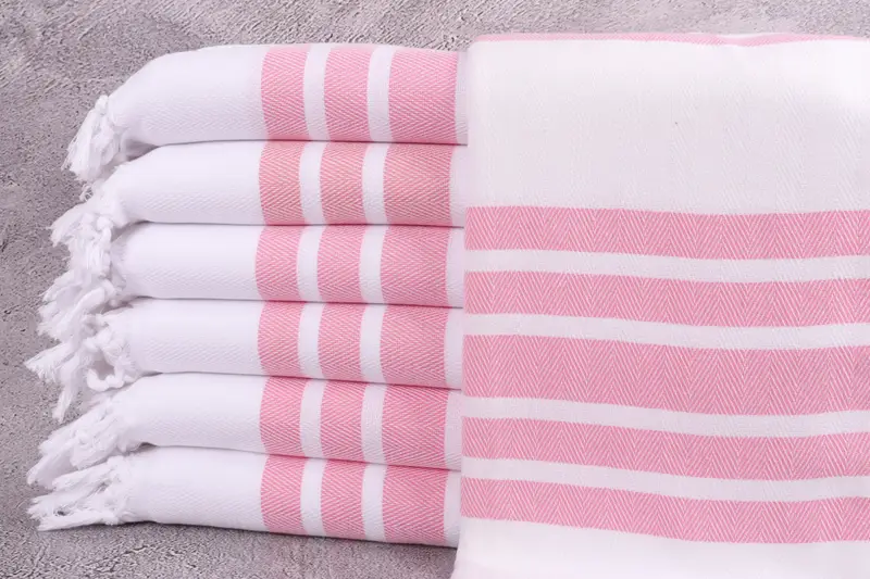 Turkish cotton towels, characterized by their flat-weave construction, are crafted from eco-friendly premium Turkish cotton, ensuring a high level of absorbency and softness. These towels are precisely woven to achieve dimensions of 40x71 inches or 100x180 centimeters, with a weight of 380 grams, allowing for a comfortable yet durable product. The hand-weaving process introduces a tolerance of up to 2 inches or 5 centimeters in the final measurements, ensuring a unique artisanal touch to each piece.