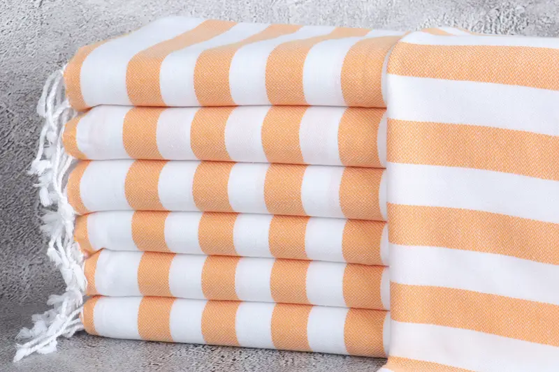 The Turkish towels are characterized by their eco-friendly premium Turkish cotton composition, ensuring both high absorbency and durability. Each towel measures 20x44 inches or 50x110 centimeters with a weight of 100 grams. Tolerances in hand-weaving can result in variations up to 2 inches or 5 centimeters.