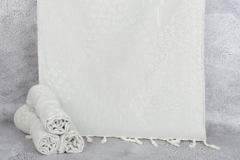 Premium organic cotton forms the basis of the towel's fiber composition, ensuring high absorbency and a lightweight, airy texture. Characterized by its gentle hand-weaving technique, the towel measures 18x36 inches (45x90 centimeters) with a tolerance of up to 2 inches or 5 centimeters. This results in a versatile product suitable for various applications.