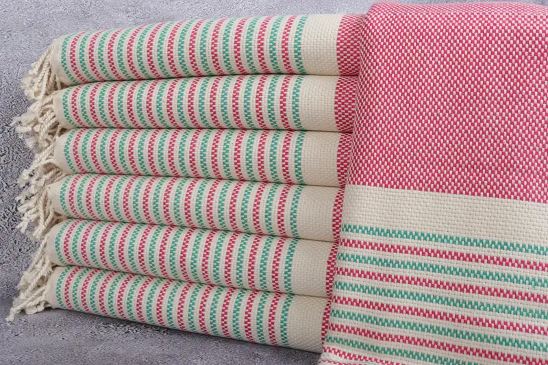 Bath Towel Organic Cotton Geometric Peshtemal, Pink and Green, 40x71 Inches