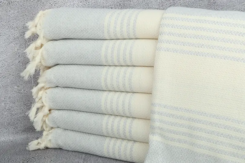 The Turkish towels are characterized by their premium Turkish cotton composition, ensuring excellent absorbency and durability. Each towel measures 70x40 inches or 100x180 centimeters, with a weight of 400 grams. Weaving tolerances may result in a variation of up to 2 inches or 5 centimeters.