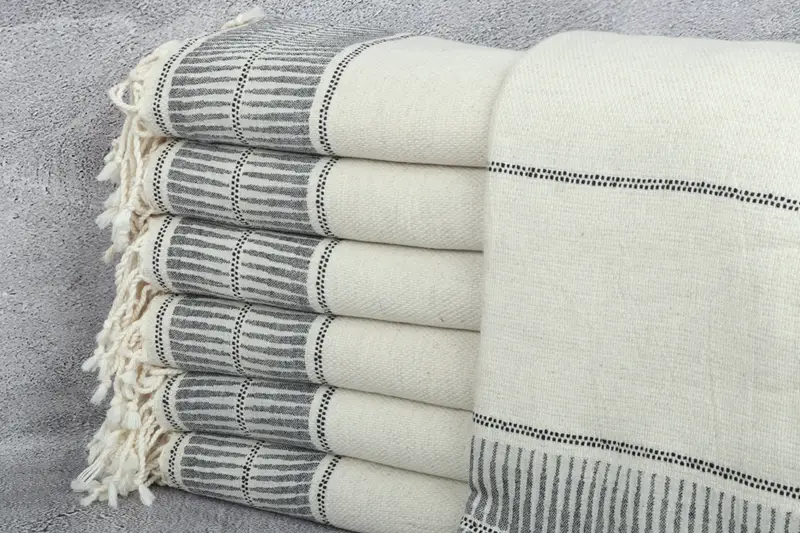 Organic Turkish cotton, characterized by its eco-friendly premium composition, ensures a soft texture and high absorbency. The towels, measuring 70x40 inches or 100x180 centimeters with a tolerance of up to 5 centimeters, weigh 340 grams. Hand-weaving results in a dimensional variance up to 2.5 centimeters.