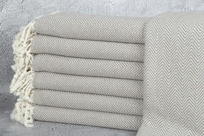 The Turkish towels are characterized by their organic Turkish cotton composition, ensuring exceptional absorbency and lightweight properties. Dimensions for the beach towel, hand towel, and Turkish blanket are standardized at 40x71 inches or 100x180 centimeters, with a tolerance of 2 inches or 5 centimeters due to hand-weaving techniques. Weighing 400 grams, the towels exhibit precise craftsmanship with slight variations.