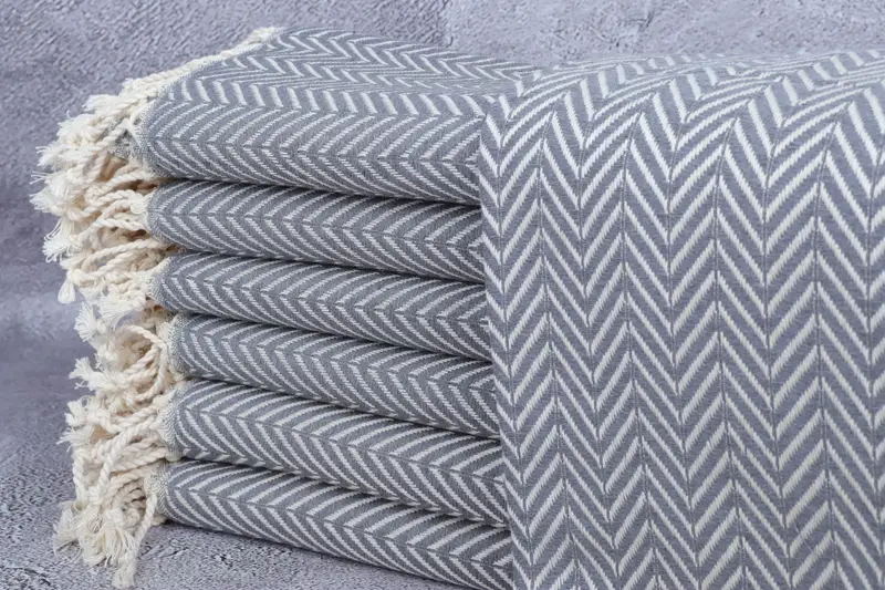 The Turkish towels are woven using eco-friendly premium Turkish cotton, ensuring superior absorbency and softness. Characterized by a hand-weaving process, the beach towel dimensions are 40x71 inches or 100x180 centimeters, with a tolerance of up to 2 inches or 5 centimeters. Weighing 450 grams, these towels are designed to be versatile for various uses.