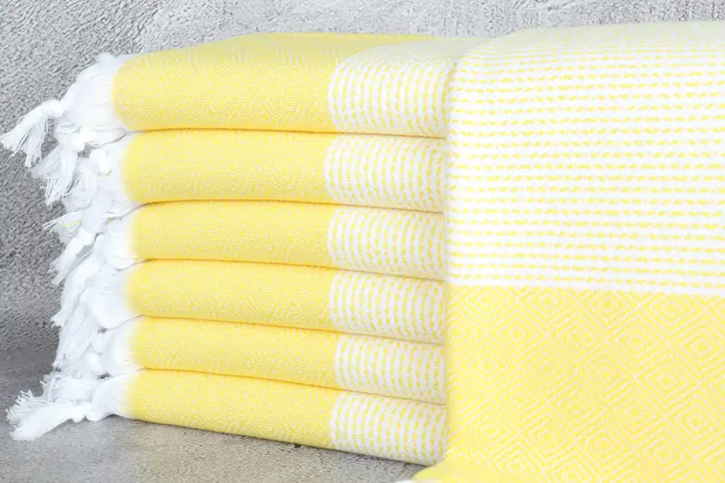 Organic Turkish Cotton towels, characterized by their flat-weave design, ensuring exceptional lightweight and space efficiency. Specifications highlight a dimension of 40x71 inches or 100x180 centimeters, with a tolerance of up to 2" or 5 centimeters due to hand-weaving techniques. Each towel weighs 360 grams, maintaining consistent quality across large orders.