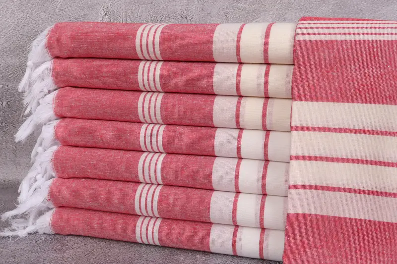 The handmade Turkish towels are made of organic Turkish cotton, characterized by exceptional absorbency. Ensuring a durable yet lightweight textile, the towels measure 40x71 inches or 100x180 centimeters, weighing 216 grams. Weaving tolerances of up to 2 inches or 5 centimeters are standard, resulting in consistent product quality.