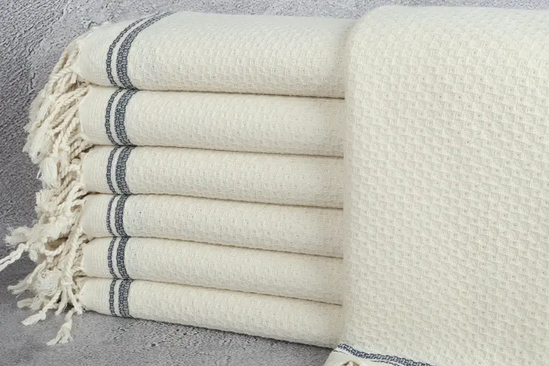 Organic Turkish cotton, ensuring superior quality, features prominently in our product line, renowned for its soft texture and high absorbency. These towels, characterized by dimensions of 36x67 inches or 90x170 centimeters, weigh 440 grams each. Hand-woven using traditional techniques, they have a tolerance of 1-2.5cm in size variations due to the nature of the craft.