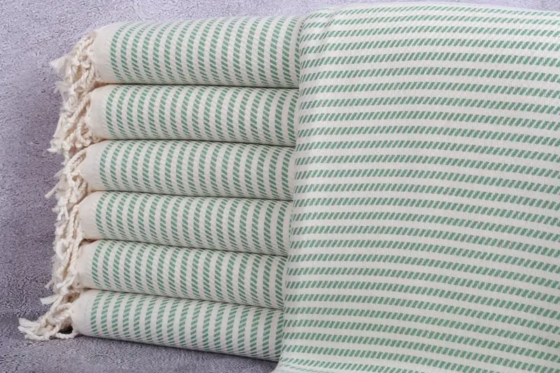 The towels and blankets are made from eco-friendly premium Turkish cotton, ensuring durability and superior absorbency. Characterized by their hand-woven construction, each piece measures 40x71 inches or 100x180 centimeters, weighing 340 grams. Tolerances in weaving may vary by up to 2 inches or 5 centimeters.