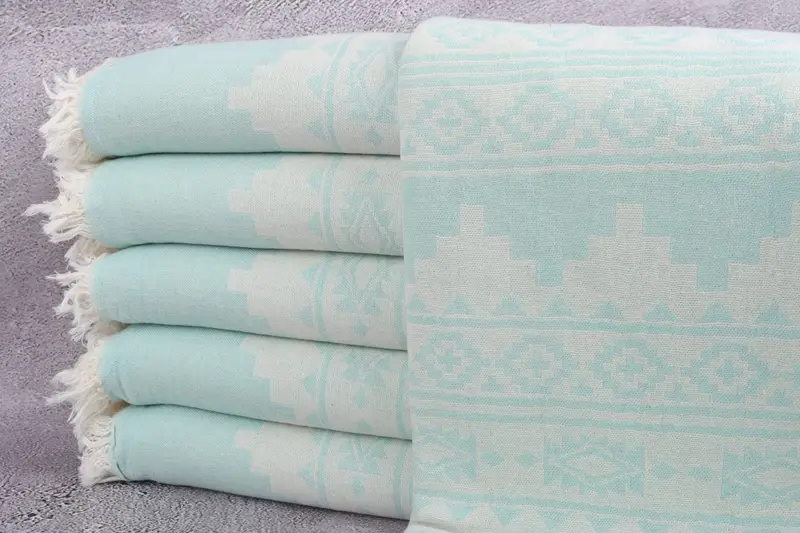 Eco-friendly premium Turkish cotton characterizes the handmade towels and blankets, ensuring breathability and absorbency. Measuring 36x71 inches or 90x180 centimeters with a 2-5 cm weaving tolerance, these towels weigh 340 grams. Hand-weaving results in slight dimension variations.
