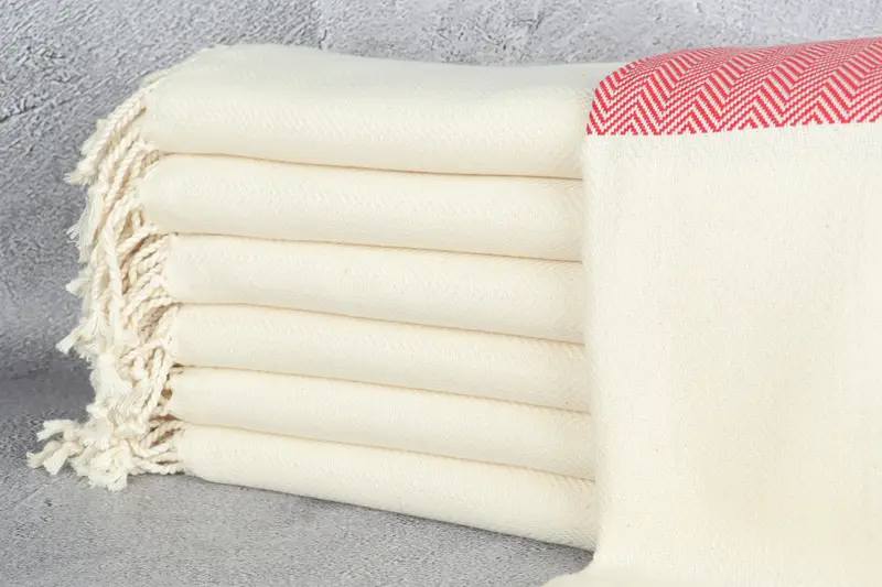 The product is characterized by its organic Turkish cotton composition, ensuring superior absorbency. The towels are meticulously handcrafted, measuring 36x71 inches or 90x180 centimeters, with a weight of 400 grams. Hand-weaving tolerances permit variations up to 2 inches or 5 centimeters.