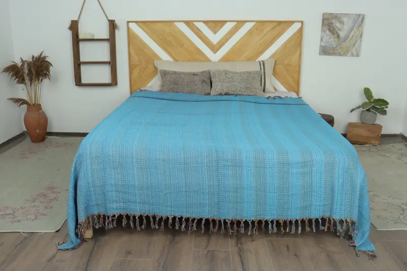 Home Decor Turquoise Blanket, Embroidered Bedspread, 87x89 Inches