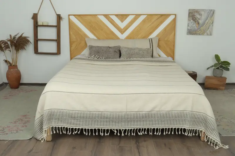 Turkish Blanket Handwoven Khaki Green Striped Organic Cotton, 95x103 Inches