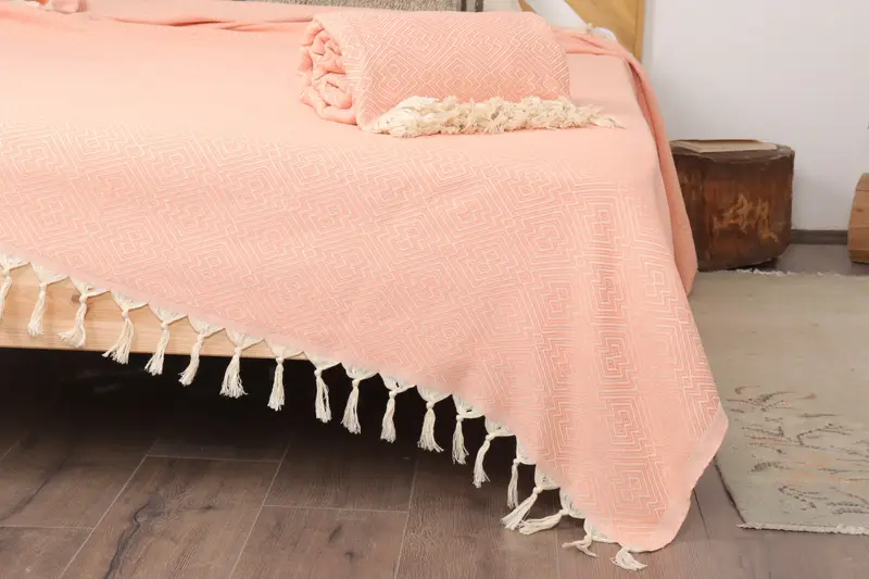 Large Handwoven Turkish Cotton Salmon Throw, Beige, 79x91 Inches