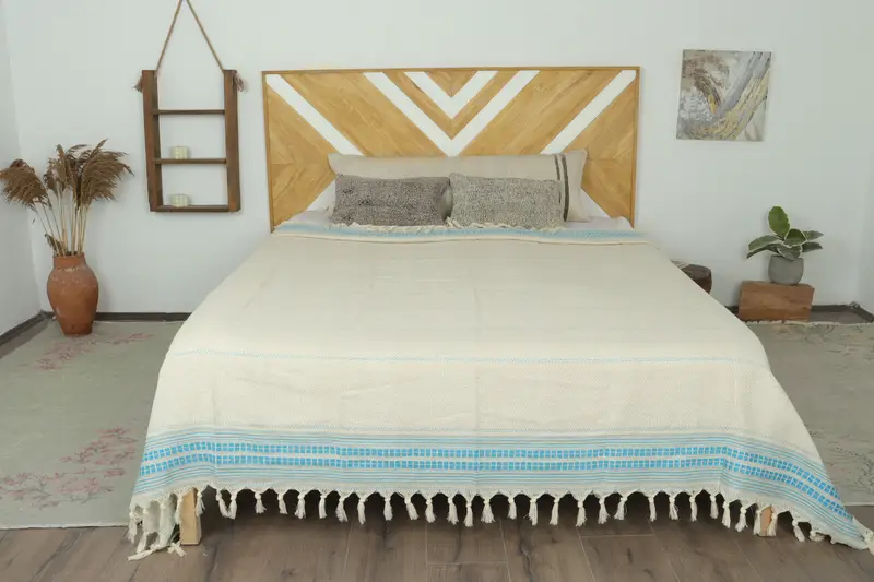 Turkish Throw Blanket Turquoise Beige, 93x95 Inches Linen Cotton
