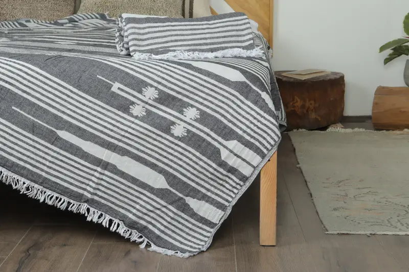 Turkish Bedspread Black Patterned Blanket, Beige, 60x83 Inches