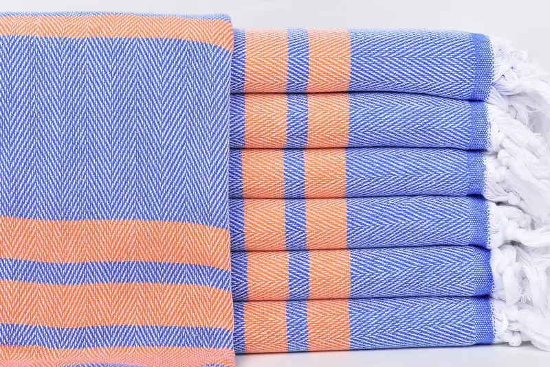 Personalized Turkish Towel Beach, Sax Blue-Orange with Beige, 36x67 Inches