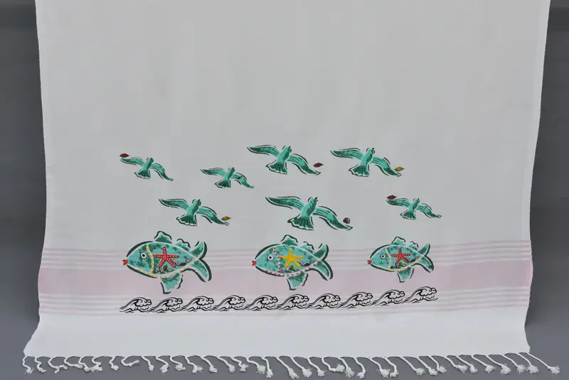 Beach Towel Chic Pareo Green Pink Fish Print, Soft Cotton, 40x70 Inches