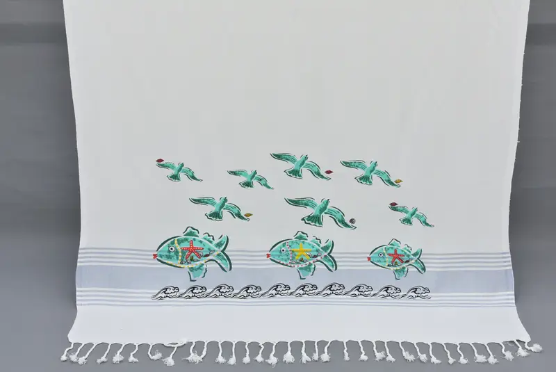Beach Towel Organic Turkish Cotton White Green Fish Print, 40x70 Inches