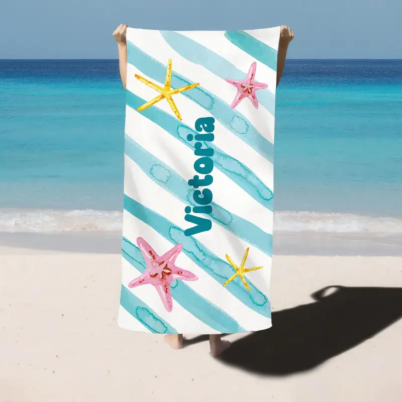 Personalized Beach Towel Blue Aqua Stripes Organic Cotton, 28x53 Inches