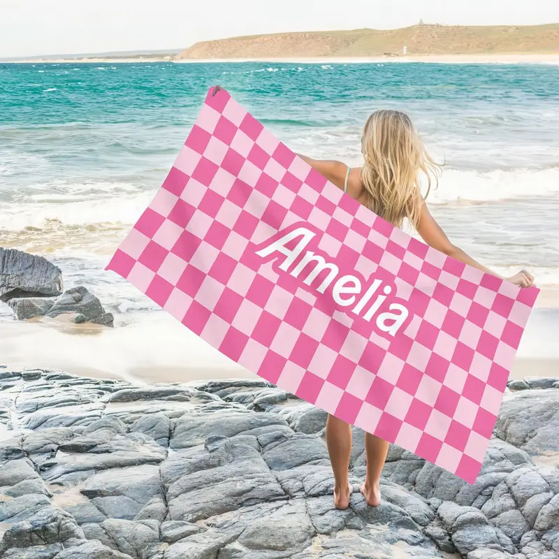 Personalized Turkish Beach Towel Organic Cotton Pink Checkerboard, 28x53 Inches
