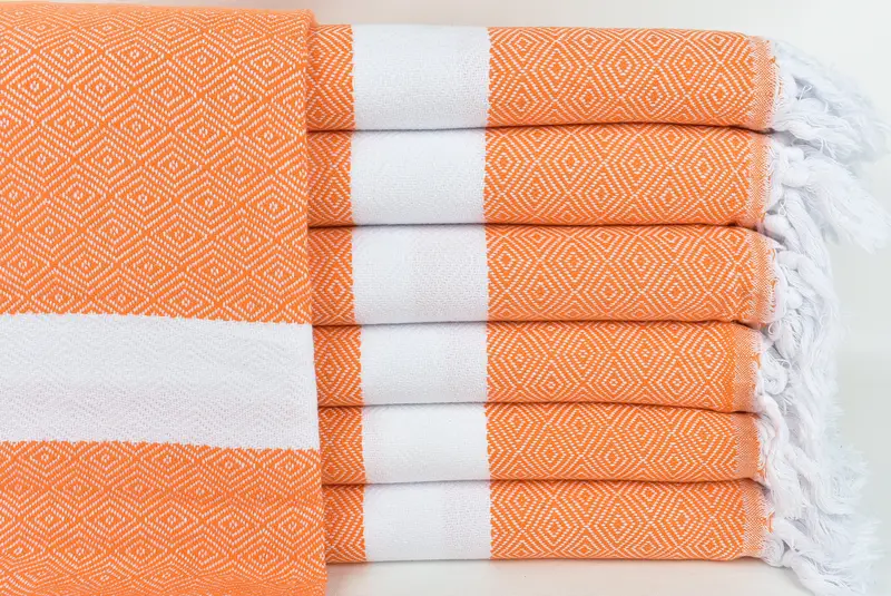 Embroidered Turkish Cotton Beach Towel Orange Diamond, Beige 40x71 In