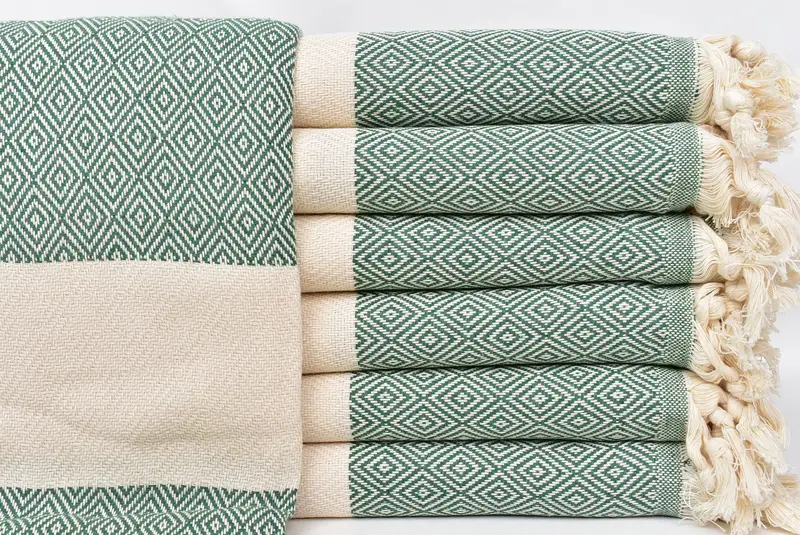 Turkish towels are manufactured from premium Turkish cotton, ensuring rapid absorbency and quick drying times. Characterized by their hand-weaving technique, these towels maintain a tolerance of 1-2.5 cm in dimensions, with a standard size of 40x71 inches or 100x180 cm. Each towel weighs approximately 420 grams, providing a soft and durable experience.