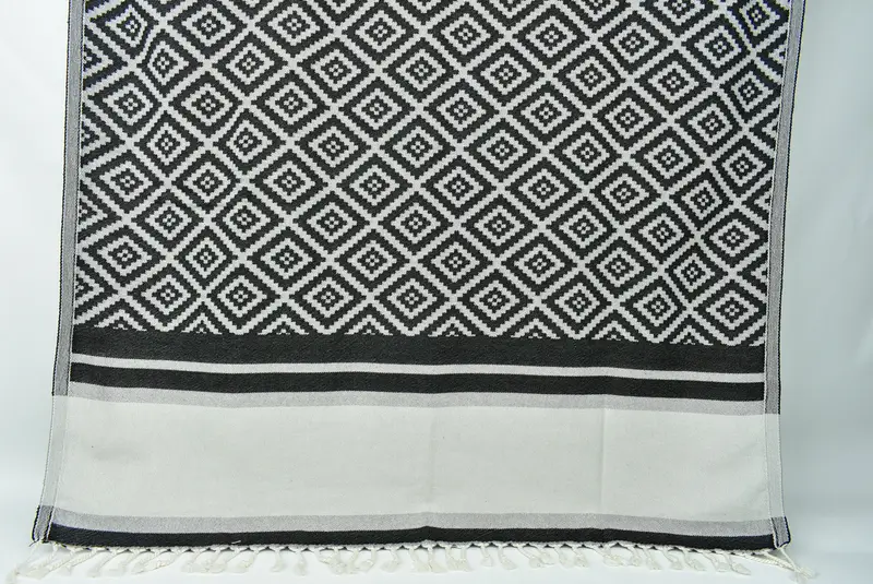 Hand-loomed Turkish towels are characterized by traditional craftsmanship using premium Turkish cotton, ensuring high absorbency and rapid drying times. Measuring 36x69 inches (90x175 cm) with a tolerance of 1-2.5 cm, these towels weigh approximately 420 grams, providing durability and versatility. Embroidery customization options are available, with pre-shrunk towels shipped worldwide via DHL Express or FedEx, ensuring 2-5 business days delivery and a satisfaction guarantee with return options.