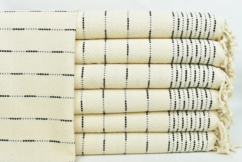 The Turkish hand towels are woven using traditional hand looms with premium Turkish cotton, ensuring superior absorbency and quick drying times compared to conventional towels. Characterized by their durability and softness, these towels exhibit a weight of around 140 grams and dimensions of 18x36 inches (45x90 cm). The hand-weaving process results in a tolerance of 1-2.5 cm in the final dimensions.