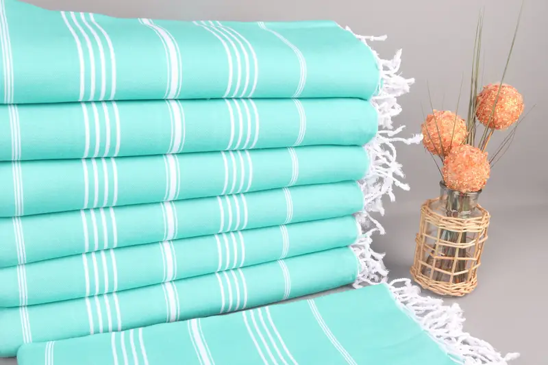 Turkish Beach Towels are characterized by their material composition of organic cotton yarn, ensuring durability and eco-friendliness. These towels, measuring 38x73 inches (95x185 centimeters) and weighing 280 grams, allow for slight size variations due to hand-weaving techniques. Customers can personalize their orders with embroidery options, customizing their towels for special occasions.