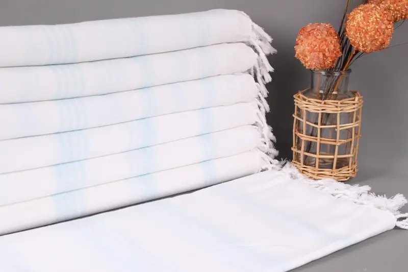 Turkish cotton towels are woven using premium organic cotton yarn, ensuring a natural fiber composition that is gentle on the skin. These towels are characterized by their exceptional absorbency, resulting in efficient water wicking and quick drying. The dimensions of the towels are 36x71 inches (90x180 centimeters) with a tolerance of up to 2 inches (5 centimeters) due to hand-weaving techniques. Each towel weighs 210 grams, providing a balance of lightweight and substantial use.