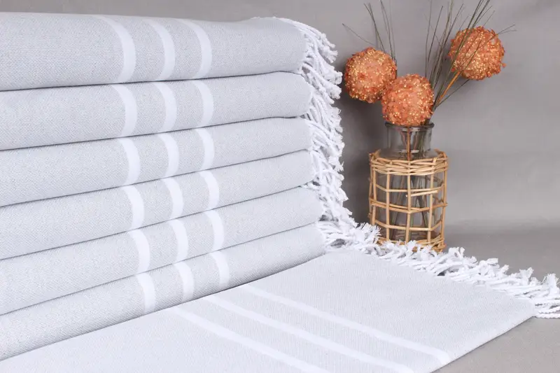 Characterized by hand-weaving, these Turkish beach towels are crafted from organic cotton yarn, ensuring high absorbency and durability. Measuring 40x71 inches (100x180 centimeters), with a weight of 380 grams, the handmade nature results in dimensional tolerances of up to 2 inches (5 centimeters).