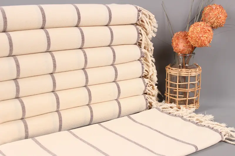 Turkish towels are characterized by their organic cotton yarn composition, ensuring superior absorbency and softness. Dimensions of 38x67 inches (95x170 centimeters) provide versatile use across various applications, with a weight of 340 grams. Hand-weaving tolerances allow for size variations up to 2 inches (5 centimeters).