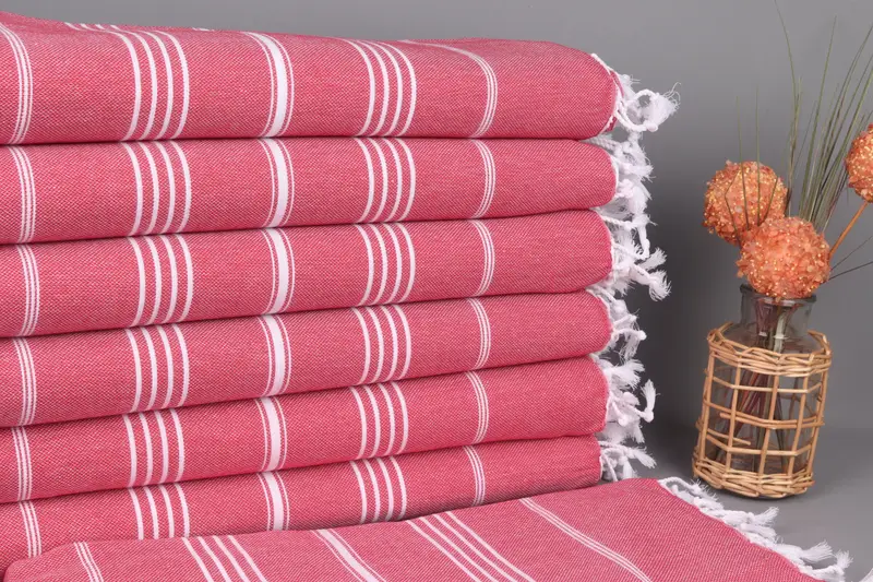The Turkish towels are woven using premium organic cotton yarn, ensuring high quality and natural absorbency. Characterized by their multi-functionality, these towels measure 40x71 inches (100x180 cm) with a tolerance of up to 2 inches (5 cm) due to the hand-weaving process, and they weigh 265 grams. They can be personalized via embroidery and are pre-shrunk, offering customization options and expedited shipping within 3-5 days. Complimentary shipping is provided for orders over 35 USD, with worldwide delivery available.