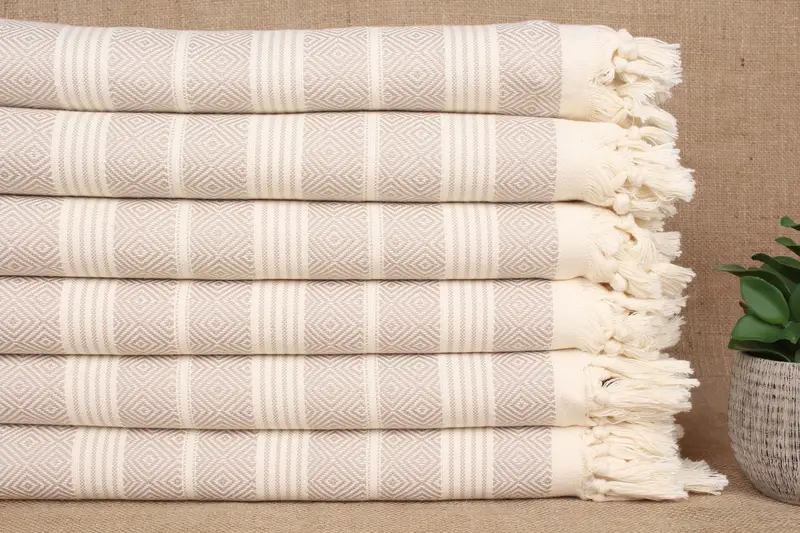 Beach Towel Embroidered Beige Diamond, Organic Cotton, 38x69 Inches