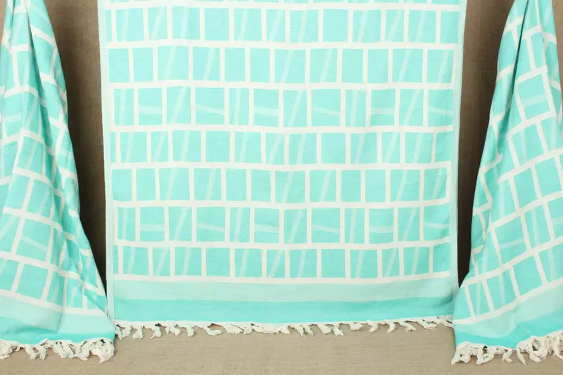 The fiber composition of Turkish towels includes pure organic cotton, which ensures high absorbency and rapid drying. Resulting in a lightweight, flat-woven texture, this material is ideal for various uses. Each handmade Turkish towel weighs approximately 360 grams and measures 34 by 69 inches, or 85 by 175 centimeters, with a weaving tolerance of ± 2 inches or 5 centimeters.