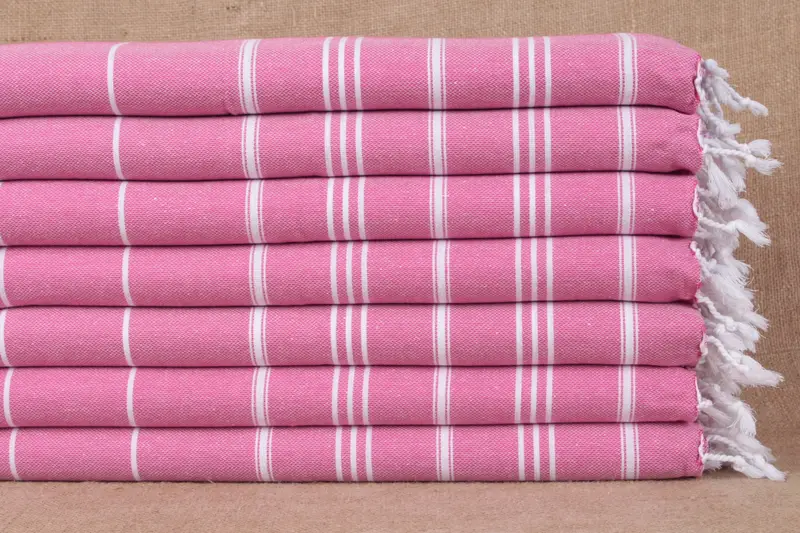 The kitchen towel, Turkish tea towel, and striped peshkir are composed of pure organic cotton, ensuring high absorbency and quick drying times. Measuring 22x40 inches (55x100 cm) and weighing approximately 100 grams, these towels are handcrafted with double-faced knitting. Weaving tolerances account for variations up to ± 2 inches (5 cm).