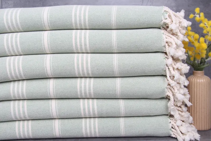 The Turkish bath towels are crafted from 100% organic Turkish cotton, ensuring high absorbency and durability. These towels, characterized by their natural dyeing process, weigh 300 grams and measure 40x71 inches, translating to 100x180 centimeters. The hand-woven construction allows for a tolerance of 1-2.5 cm, enhancing the product's artisanal quality.