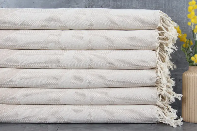 Turkish towels are characterized by their composition of 100% organic Turkish cotton, naturally dyed to maintain the integrity of the fibers. Ensuring a weight of 90 grams per square meter, these towels measure 18x38 inches or 45x95 centimeters, providing a pre-shrunk status with weaving tolerances of 1-2.5 centimeters.