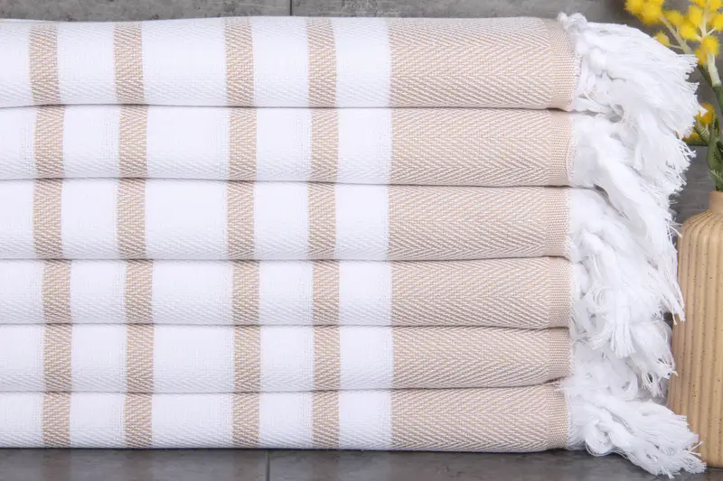 Characterized by %100 organic Turkish cotton, these towels exhibit remarkable absorbency, enhancing with each wash. Ensuring superior quality, each towel is meticulously woven, with an acceptable tolerance of 1-2.5 cm. The towels are sized at 36x67 inches or 90x170 centimeters, with a weight of 380 grams.