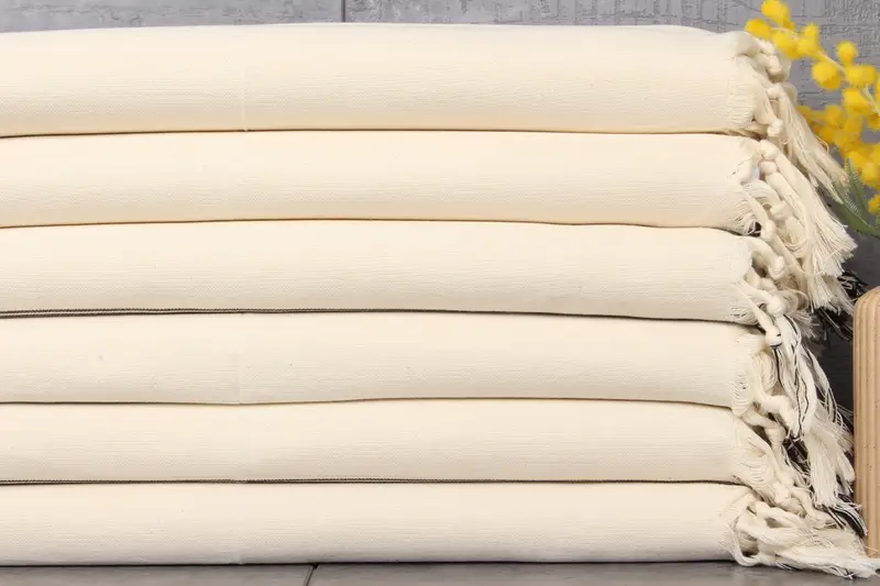 The Turkish towels and blankets are made from 100% organic Turkish cotton, naturally dyed, ensuring a soft and stylish feel. Each piece measures 18x36 inches (45x90 centimeters) with a weight of 100 grams. Hand-weaving results in tolerances of 1-2.5 cm.