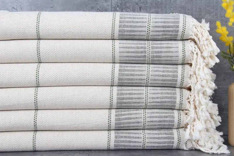 Each Turkish Towel measures 40x71 inches (100x180 centimeters) with a weight of 340 grams. The hand-weaving process allows for minor variations in dimensions, typically within a tolerance of 1-2.5 cm.