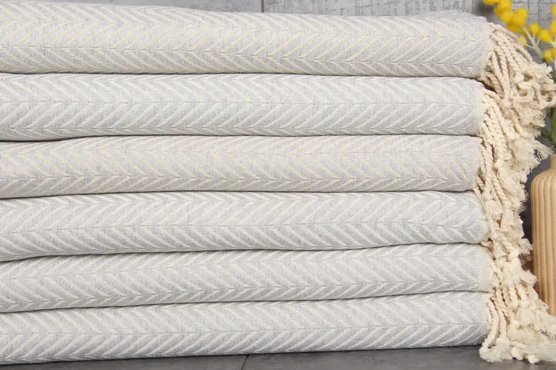 Comprising 100% organic Turkish cotton, the Light Gray Chevron Turkish Beach Towel is characterized by high absorbency. The towel's fibers, natural dyed, absorb water progressively with each wash, ensuring enhanced softness and utility. The towel's dimensions are 40x71 inches or 100x180 centimeters, with a weight of 450 grams, allowing for substantial bulk and coverage. Slight variations in hand-weaving tolerances of 1-2.5cm may occur.