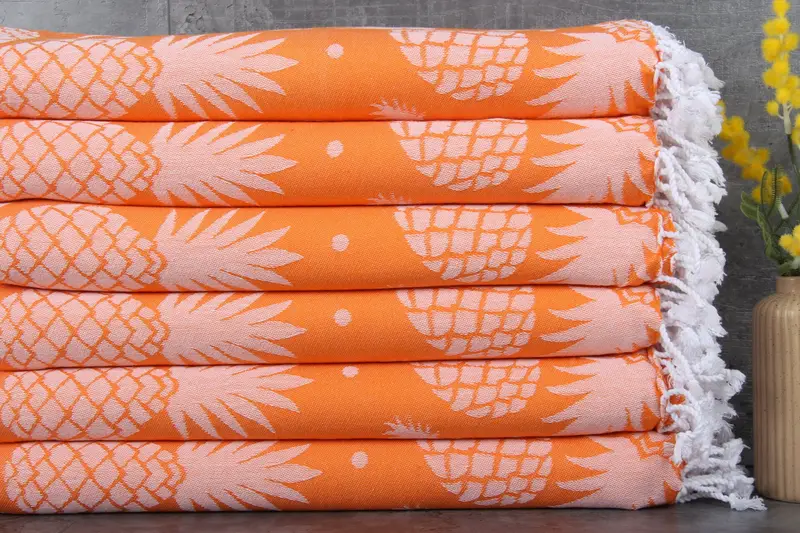 Each towel is pre-shrunk, with dimensions standardized at 40x71 inches (100x180 centimeters), a weight of 366 grams, and a secondary color of beige. The product features an intricate pineapple pattern, enhancing its aesthetic appeal while ens...