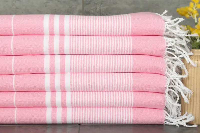 Characterized by 100% organic Turkish cotton, the 24x40 inches pink cotton hand towel ensures superior absorbency and durability. Each towel, weighing 120 grams, features a sheet size with natural dyed colors, providing a pre-shrunk status after initial washes. Towels are handwoven with a tolerance of 1-2.5cm, ensuring a high-quality finish.