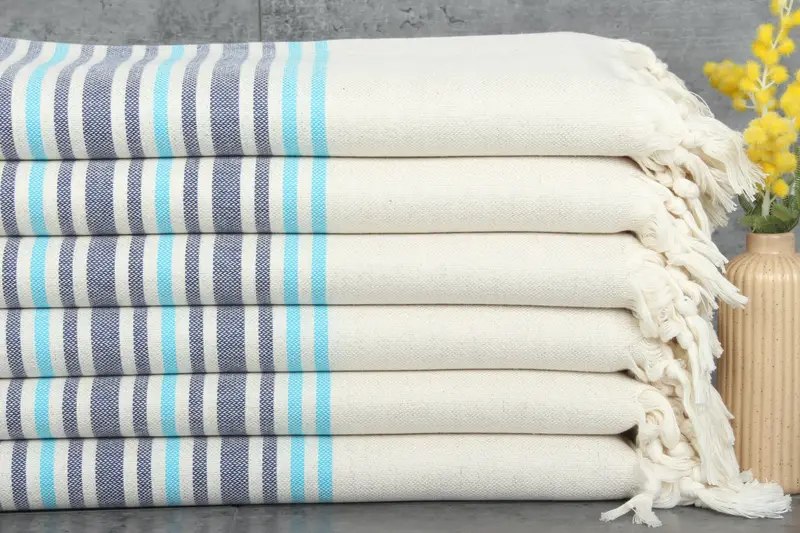 100% organic Turkish cotton characterizes these towels, ensuring natural dyeing and enhanced absorbency with each wash. Dimensions are specified as 36x71 inches or 90x180 centimeters, weighing 410 grams per unit. Hand-weaving tolerances may result in slight variations, up to 1-2.5cm in size.