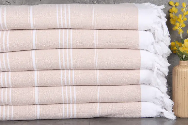 Ensuring optimal absorbency, the Turkish Beach Towel is crafted from 100% organic Turkish cotton, resulting in a towel that becomes more absorbent with each wash. Measuring 36x71 inches or 90x180 centimeters and weighing 400 grams, the towel is characterized by a hand-weaving process with tolerances of 1-2.5cm. Personalization options include monogramming, which adds 2 days to the shipping time. Pre-shrunk and washable at 30-40°C with low cycles, these towels are suitable for various uses, from beach to spa settings.