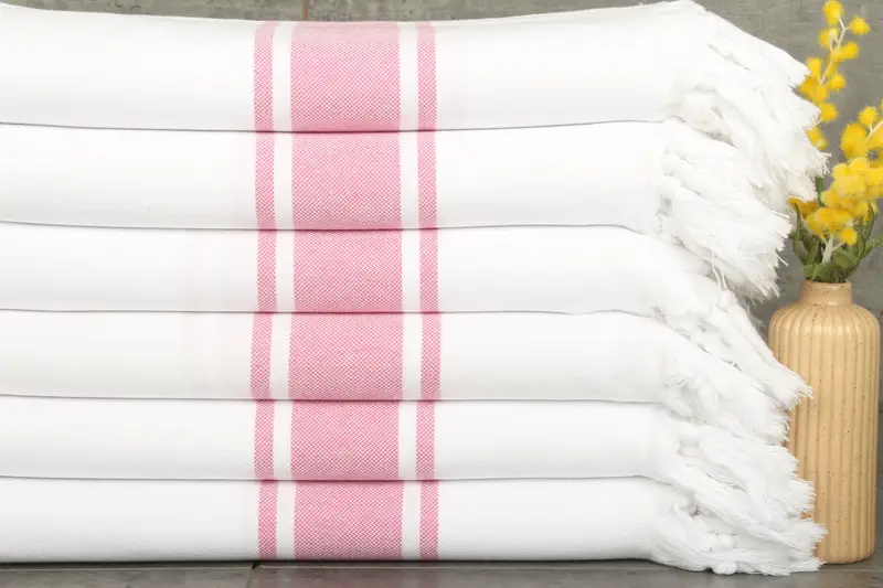 Comprising a subcategory of bath towels, secondary colors include beige, adding a subtle contrast to the primary white-fuchsia hue. These towels are ideal f...