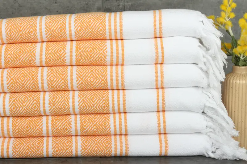 Made from 100% organic Turkish cotton, these towels are characterized by their high absorbency and softness. Each towel is woven on traditional hand looms, resulting in a final product with variations within 1-2.5 cm in dimensions. These towels measure 40x18 inches or 100x45 centimeters, with a weight of 110 grams.