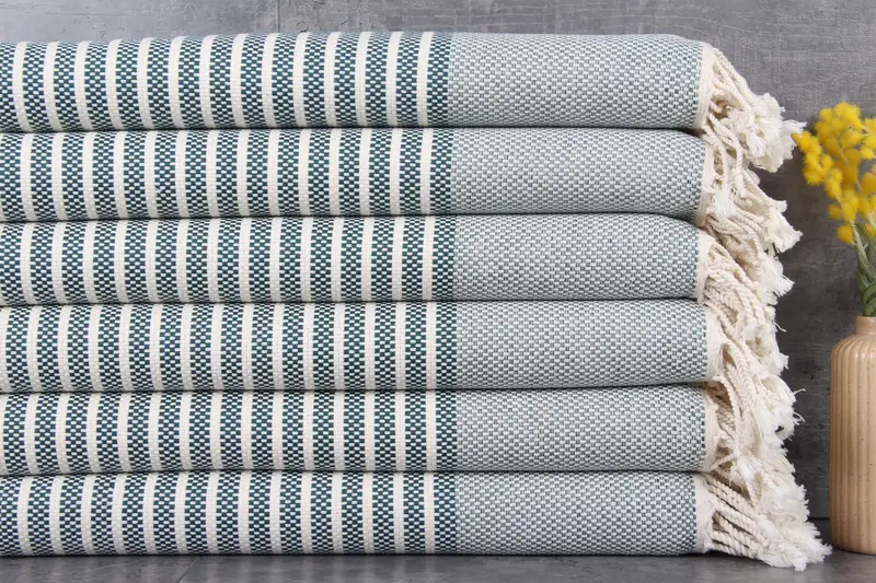 Comprising 100% organic Turkish cotton, these towels are characterized by their natural dyeing process and robust fiber composition. Ensuring high absorbency, they weigh 400 grams, offering durability and a soft texture. These towels are meticulously hand-woven, permitting a tolerance of 1-2.5 cm in dimensions.